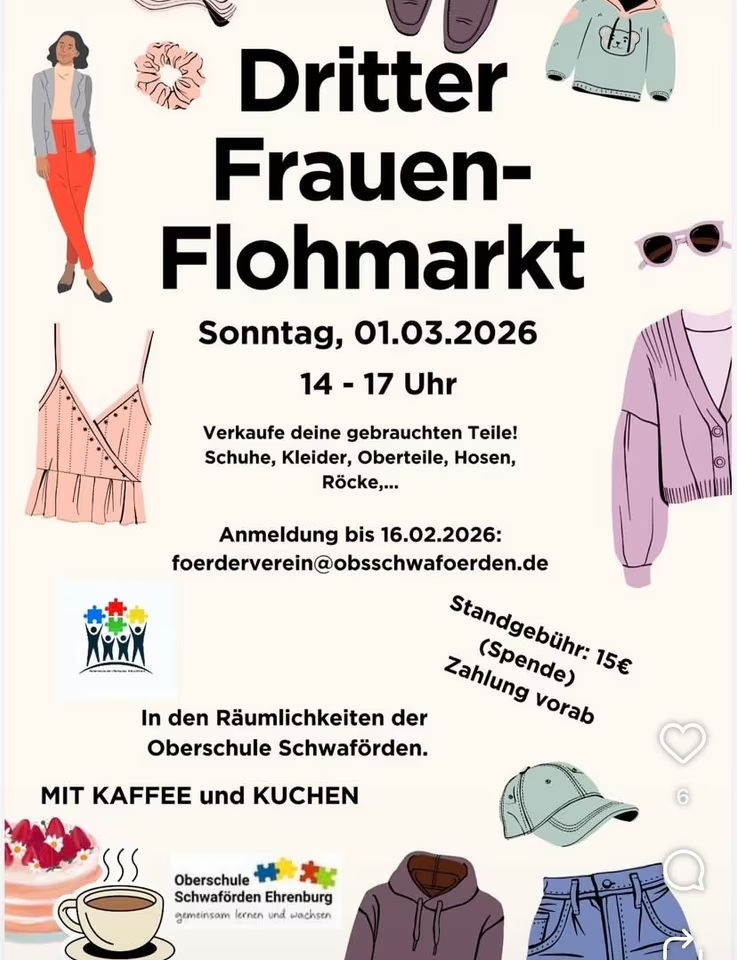Frauenflohmarkt Datum 01.03.2026 Abgelaufen! Uhrzeit 14:00 - 17:00 Standort Oberschule Schwaförden Ehrenburg Kategorie Förderverein OBS Schwaförden Veranstalter Förderverein der OBS Teile diese Veranstaltung